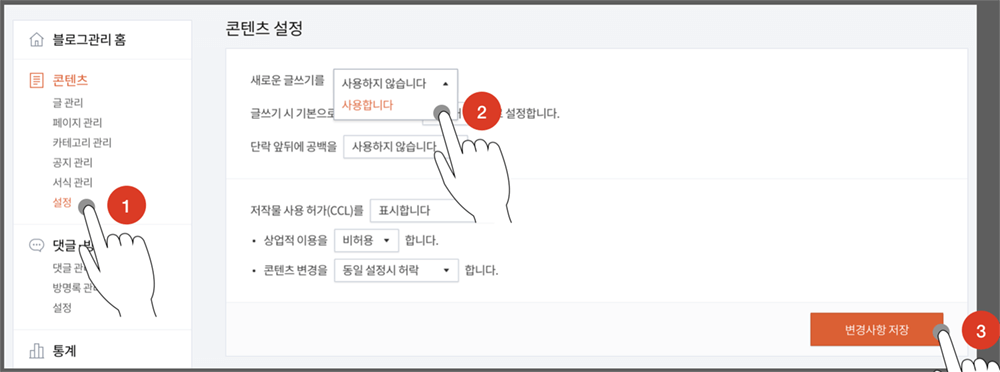 블로그관리 홈 > 콘텐츠 설정에서 새로운 글쓰기를 사용하지 않습니다로 선택하고 변경사항 저장을 하면 이전 에디터로 되돌아 갈 수 있구요.