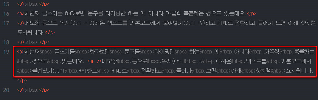 메모장 등으로 복사(Ctrl + C)해온 텍스트를 기본모드에서 붙여넣기(Ctrl +V)하고 HTML로 전환해서 들어가 보면 아래 샷처럼 띄어쓰기된 부분에는 어김없이 공백을 의미하는 nbsp;가 표시됩니다.