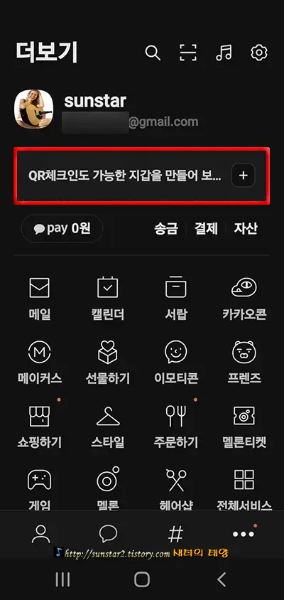 요건이 된다면 실행된 카톡 화면 오른쪽 하단 세로 3점 아이콘(더보기)을 누르면 상단에 지갑을 만들 수 있는 링크가 표시되는데요.
