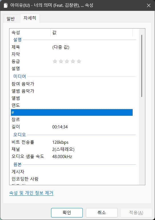 속성창이 열리면 [자세히] 탭으로 이동해 수정이나 편집하려는 항목(제목, 설명, 참여 음악가, 장르 등)을 더블 클릭하면 원하는 정보를 수정할 수 있구요.