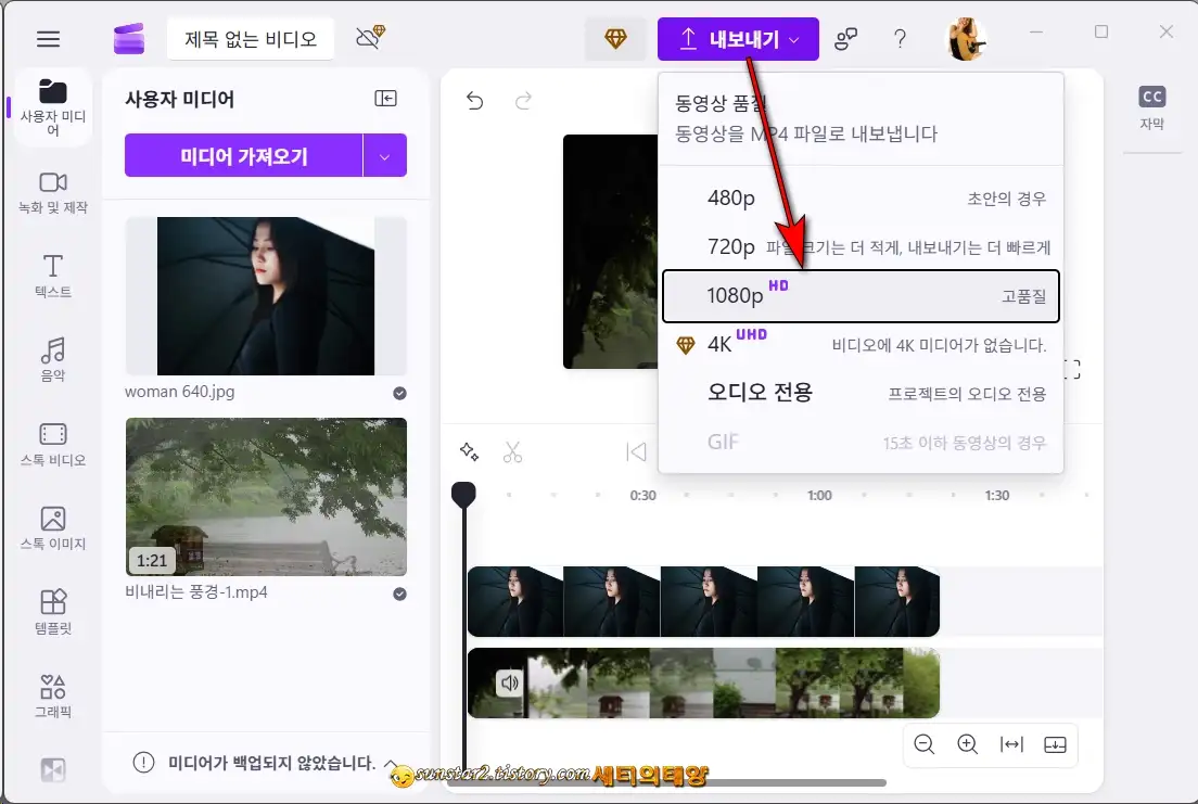 이제 동영상 편집이 끝나고 상단 [내보내기] 버튼을 누르면 네 가지 해상도로 다운로드할 수 있는데요.